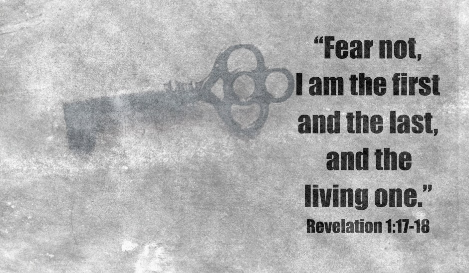 “When I saw him, I fell at his feet as though dead. But he laid his right hand on me, saying, ‘Fear not, I am the first and the last, and the living one. I died, and behold I am alive forevermore, and I have the keys of Death and Hades.'” Revelation 1:17-18